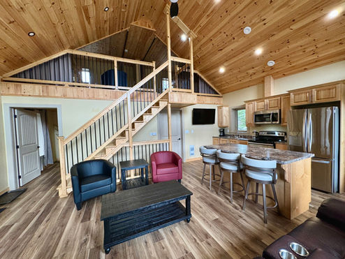 Open-concept loft accommodations sleeps up to 6 people and features single over double bunk beds with curtain tracks for added privacy. Main floor bedroom is fully accessible, and sleeps 2 people with a double bed.
